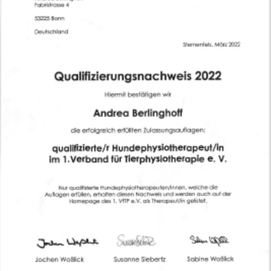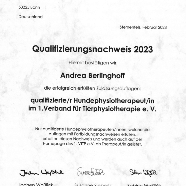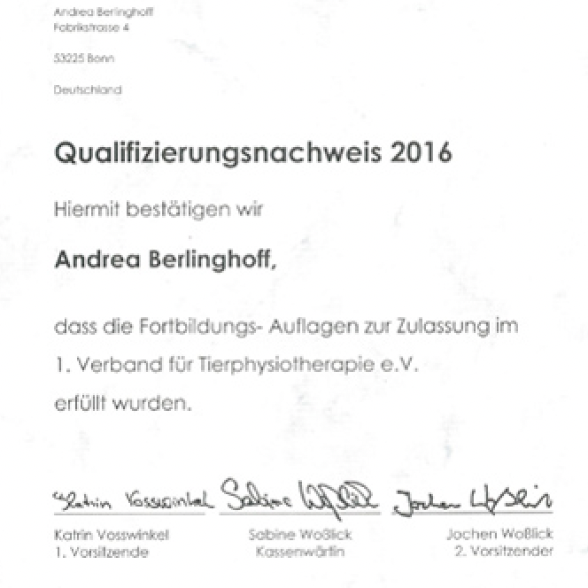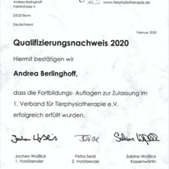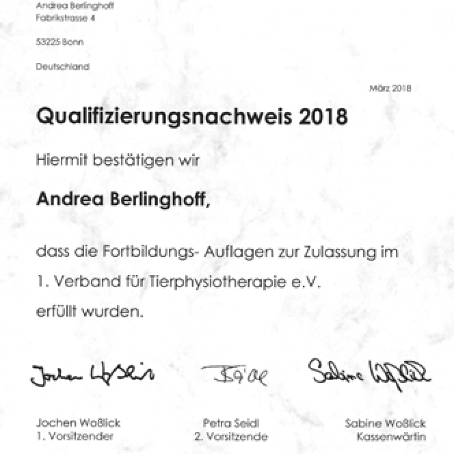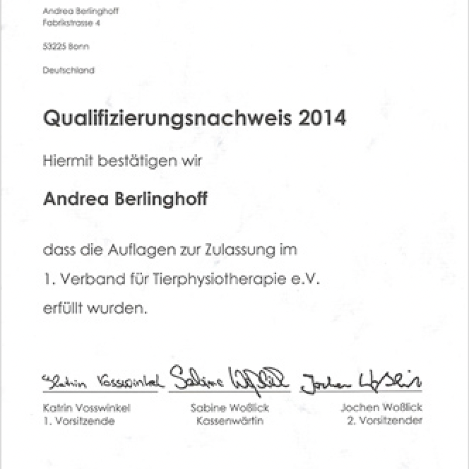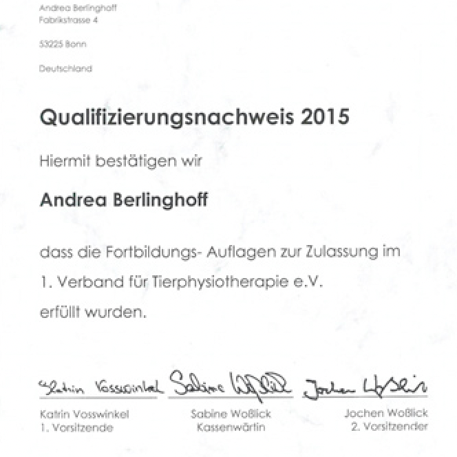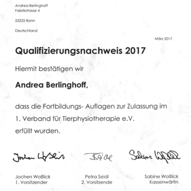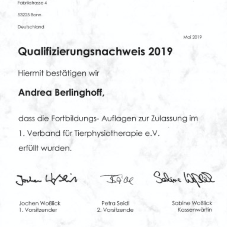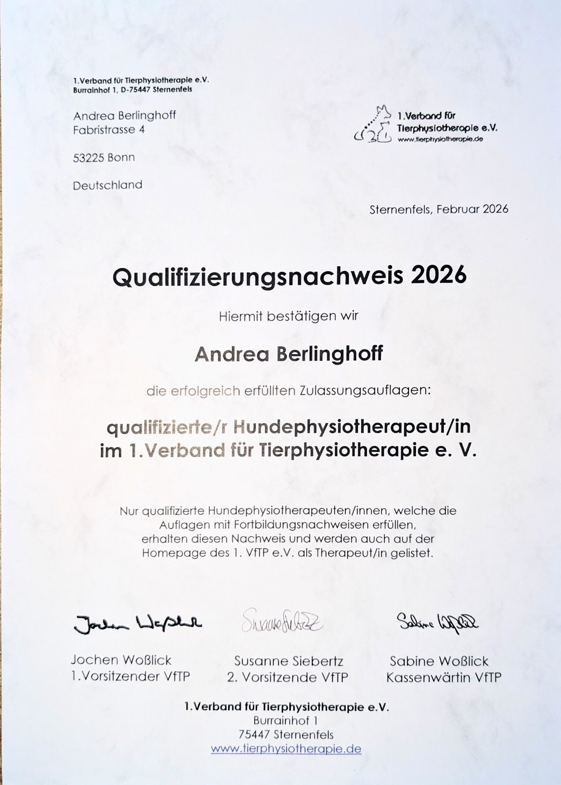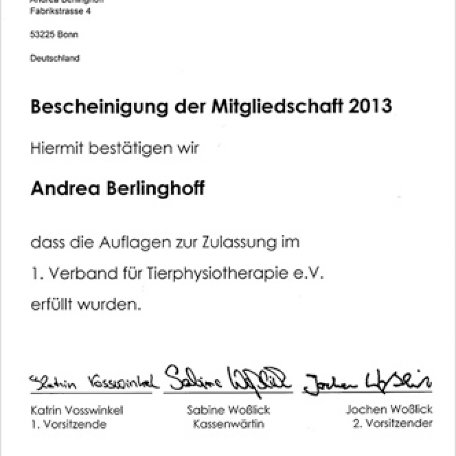 Seit 2004 ist Andrea Berlinghoff Mitglied im Verein für Tierphysiotherapie e. V. (VFTP e. V.)